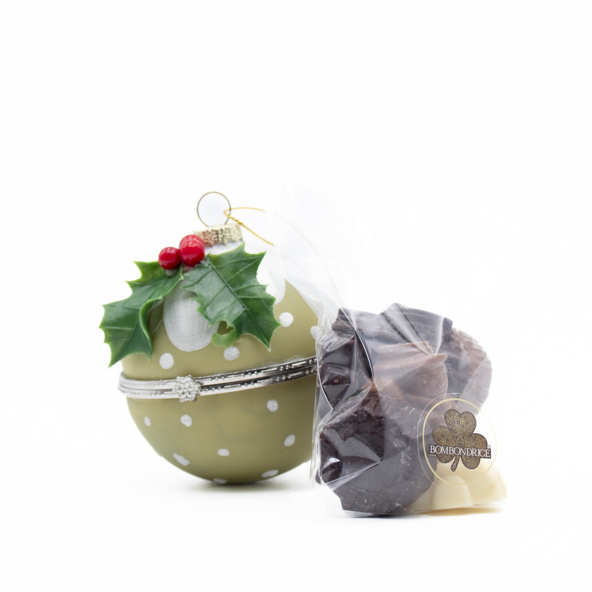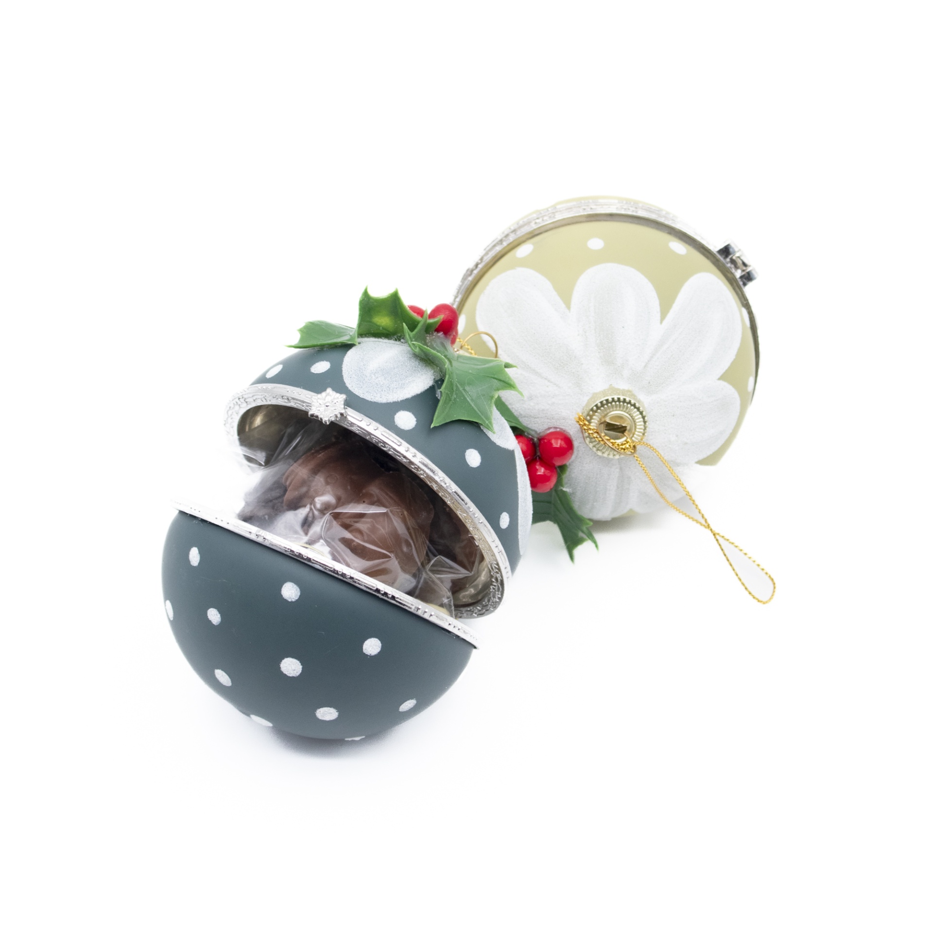 Esta bola de Natal, pintada e decorada com azevinho e fita de pendurar, esconde no interior uns deliciosos chocolates artesanais — uma surpresa doce que encanta todos.