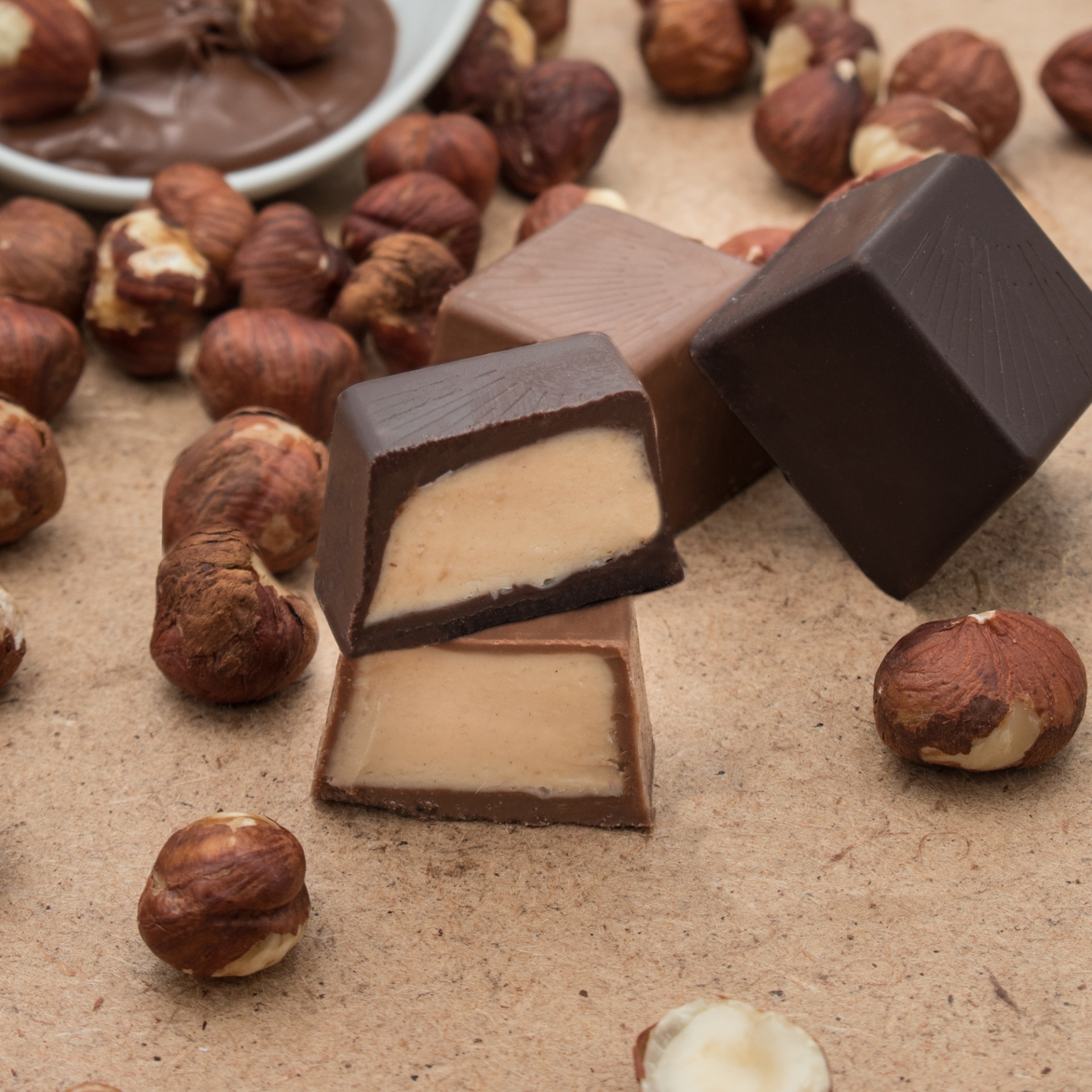 Junta-se o Chocolate Branco com a Avelã e resulta num cremoso e saboroso Praliné.