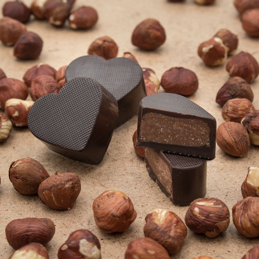 BOMBONS DE CHOCOLATE NEGRO 70% COM RECHEIO DE PRALINÉ DE AVELÃ