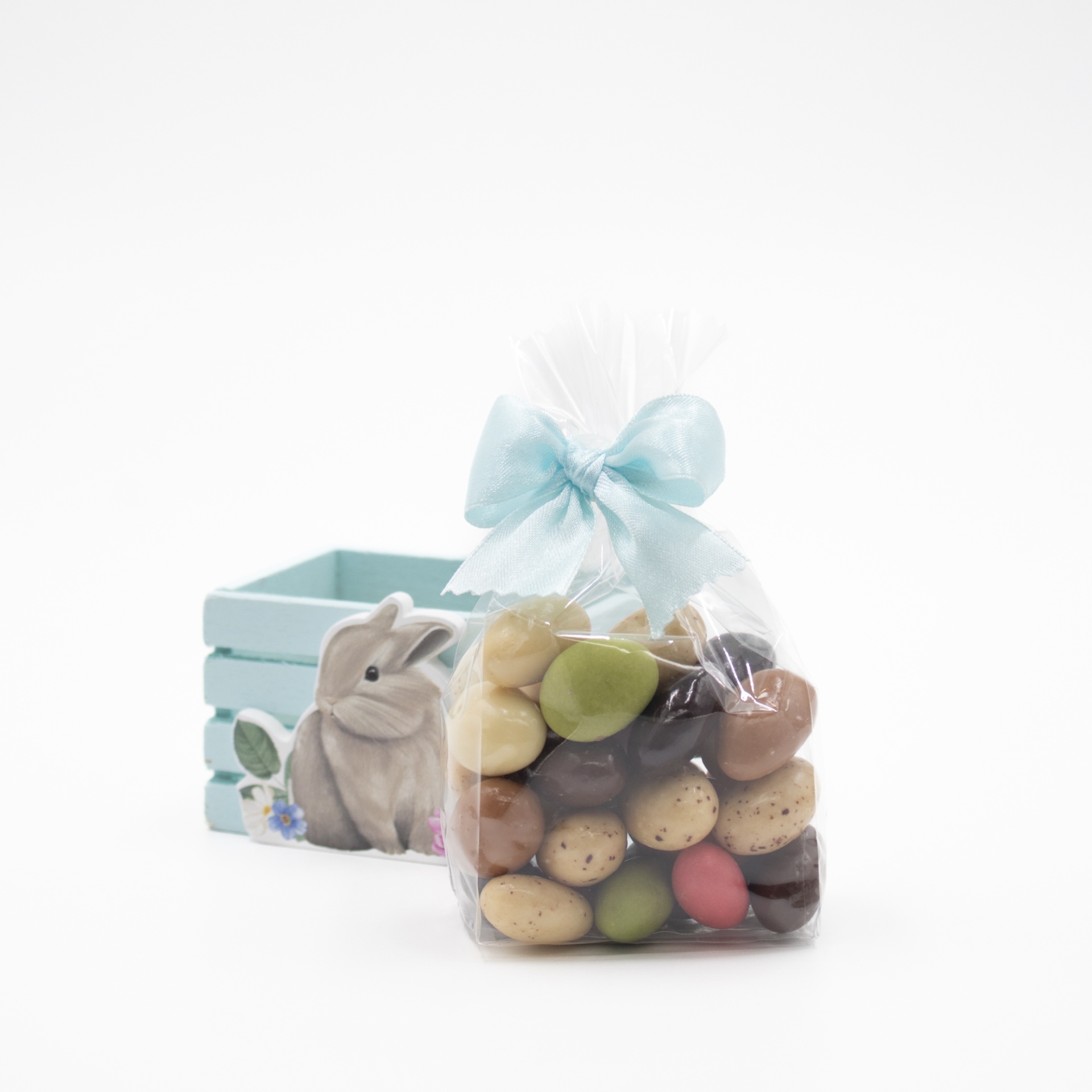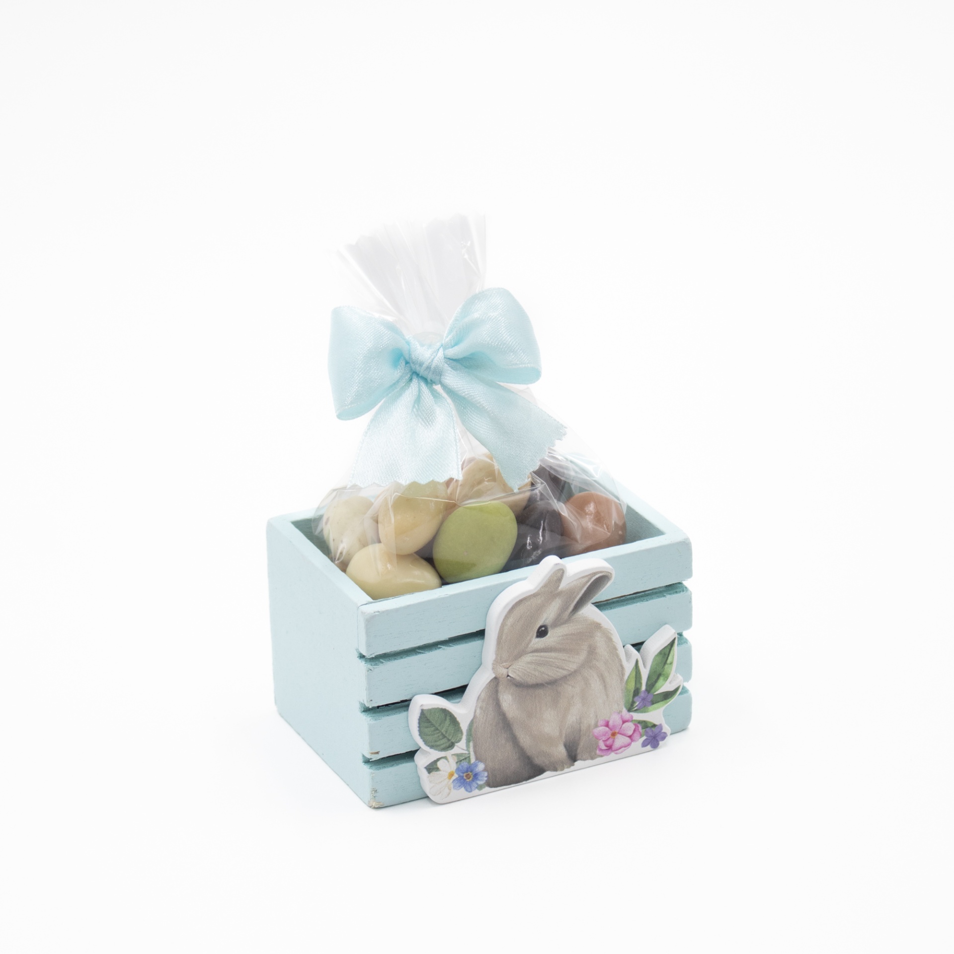 Esta pequena caixa de madeira decorativa, com figura temática de Páscoa e disponível em 4 cores diferentes, inclui 125g de sortido de amêndoas, cuidadosamente selecionadas para proporcionar uma experiência doce e variada.