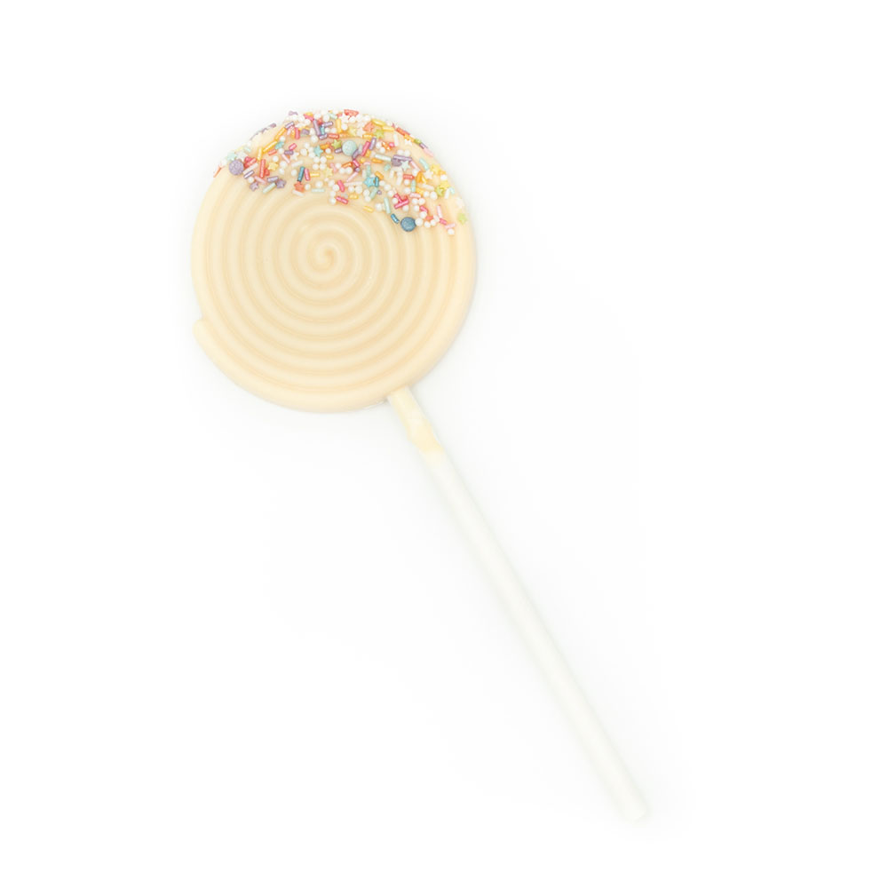Chupa de Chocolate Branco - Ingredientes: Cacau mínimo (32%) Açúcar; manteiga de Cacau, LEITE gordo em pó, emulsionante: lecitina de girassol e aroma natural de baunilha. Decoração: Açúcar, amido de batata, manteiga de palma, óleo de girassol, farinha de arroz, amido de TRIGO, xarope de glicose, corantes: E101, E100, E132, E133, E141, E153, E172, E555, agente de revestimento e goma laca. Origem: UE e não-UE