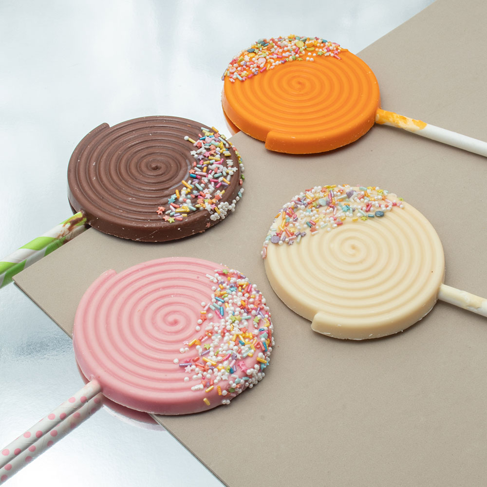 Chupas de Chocolate de Morango, Limão, Laranja, Leite ou Branco