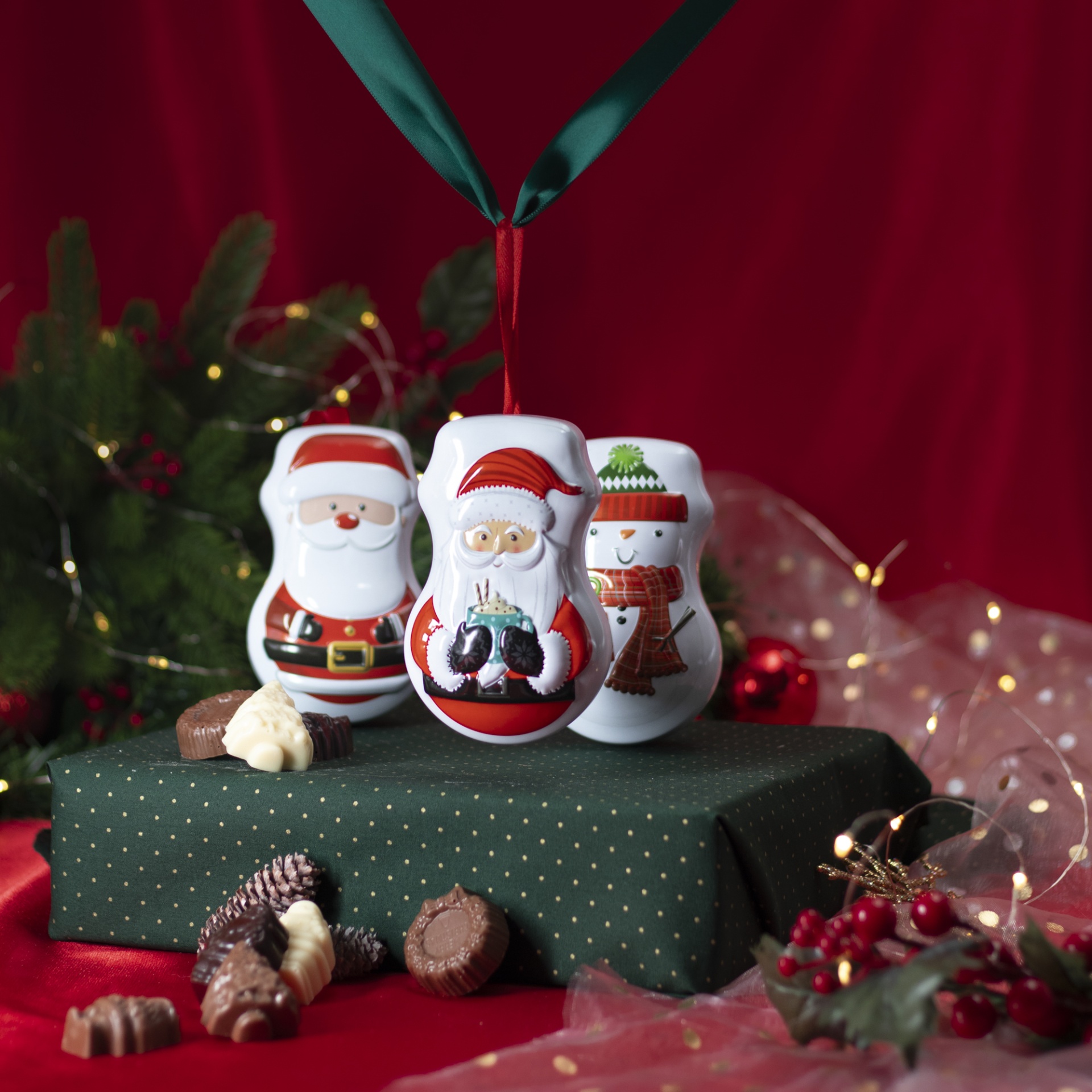 Esta adorável lata natalícia — disponível com 6 desenhos diferentes — traz no interior 75 g de bombons artesanais e uma fita para pendurar na árvore, tornando-a um presente doce e decorativo.