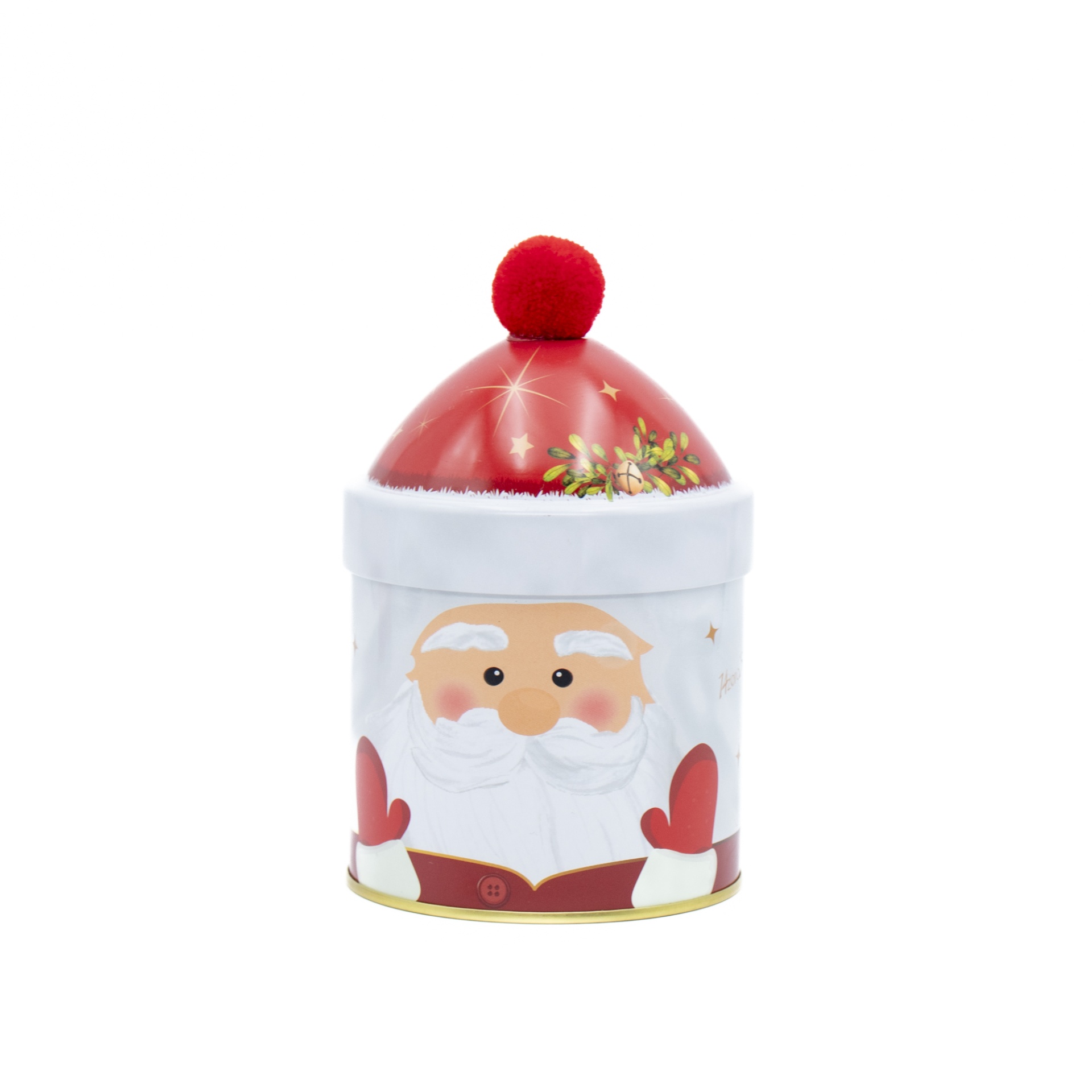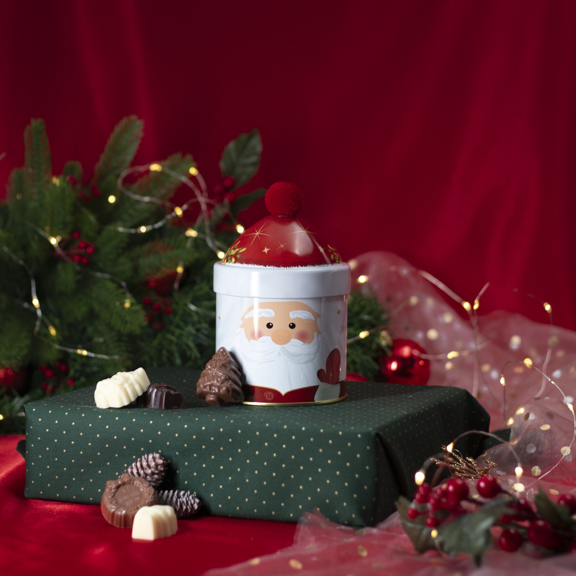 Com o seu adorável Pai Natal e tampa com pompom, esta lata guarda no interior 200 g de Bombons de Natal feitos artesanalmente.