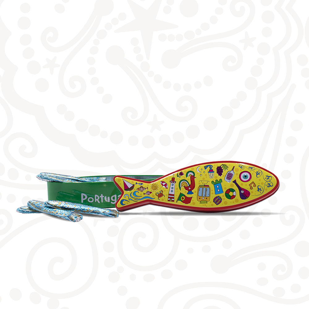 Lata em forma de Sardinha com 7 Sardinhas de Chocolate, com desenhos bem divertidos e coloridos que representam os principais símbolos de Portugal.