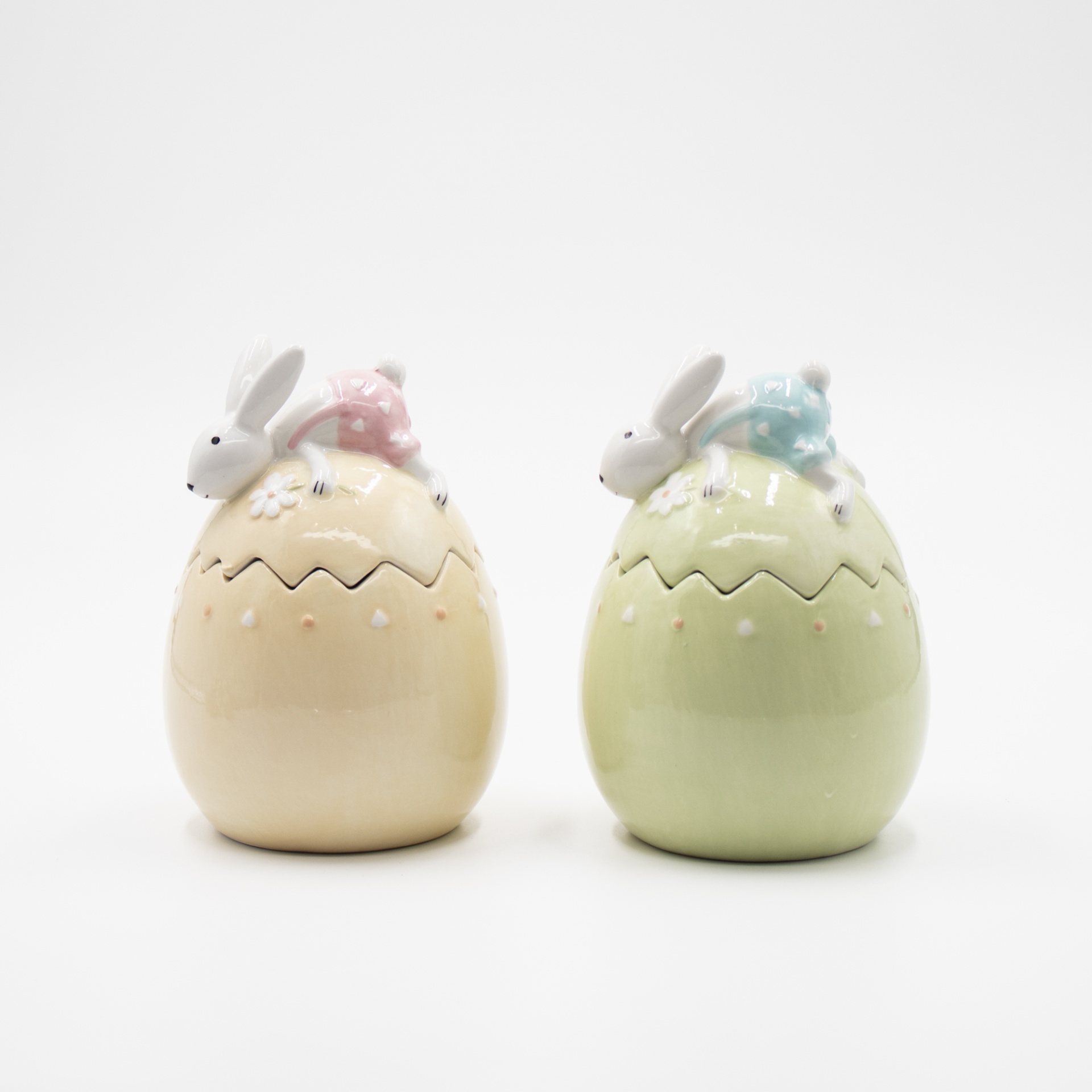 Este ovo decorativo em cerâmica, disponível em delicados tons amarelo manteiga e verde suave, destaca-se pelo seu acabamento cuidado e pela tampa adornada com um delicado coelho, criando um objeto decorativo cheio de charme.