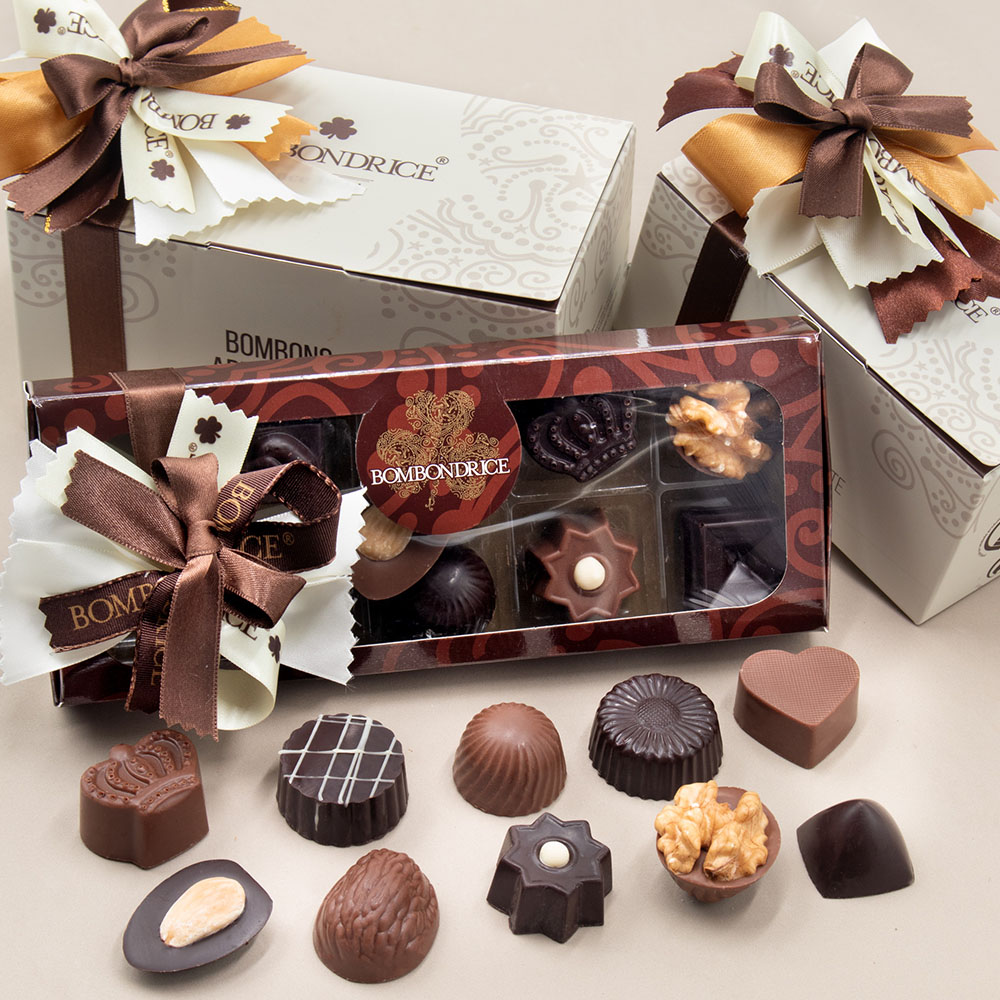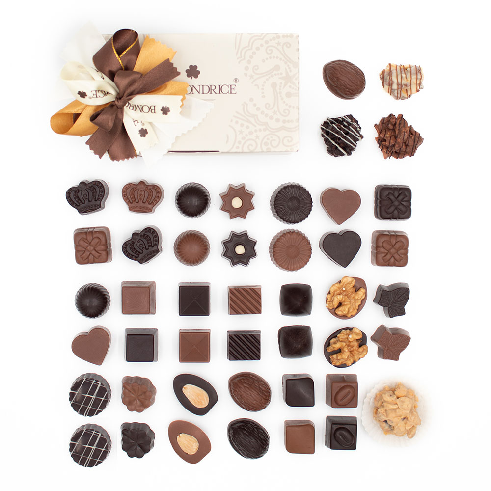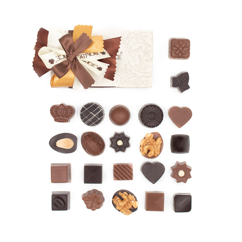 Recheios: Arroz, açúcar, cacau em pó, sal, xarope de glicose, extrato de malte de CEVADA, aroma, emulsionante (mono e diglicéridos de ácidos gordos), cacau magro em pó, vitaminas B1, B2, B3, B5, B6, B8, B9 E B12, ferro, TRIGO, LEITE em pó magro, GLÚTEN de TRIGO, LEITE condensado desnatado açúcarado (LEITE desnatado), gordura vegetal (noz de coco), E417, coco ralado, óleo de palmiste, LEITE inteiro em pó, óleo de palma, extrato de baunilha de Madagáscar, café, rum (37,5% vol), AVELÃ, AMÊNDOA, NOZES, óleo de coco, óleo de girassol, maltodextrina, framboesa em pó (6%), maracujá em pó (2,5%), manteiga de karité, manteiga Ilipe, E160a (betacaroteno), manga em pó (2,5%), fondant (açúcar cristalizado, xarope de glucose e água), glucose, aroma a mente, emulsionante E492, E322, antioxidante E304 e E306 e licor de Ginja. Origem: UE e não-UE