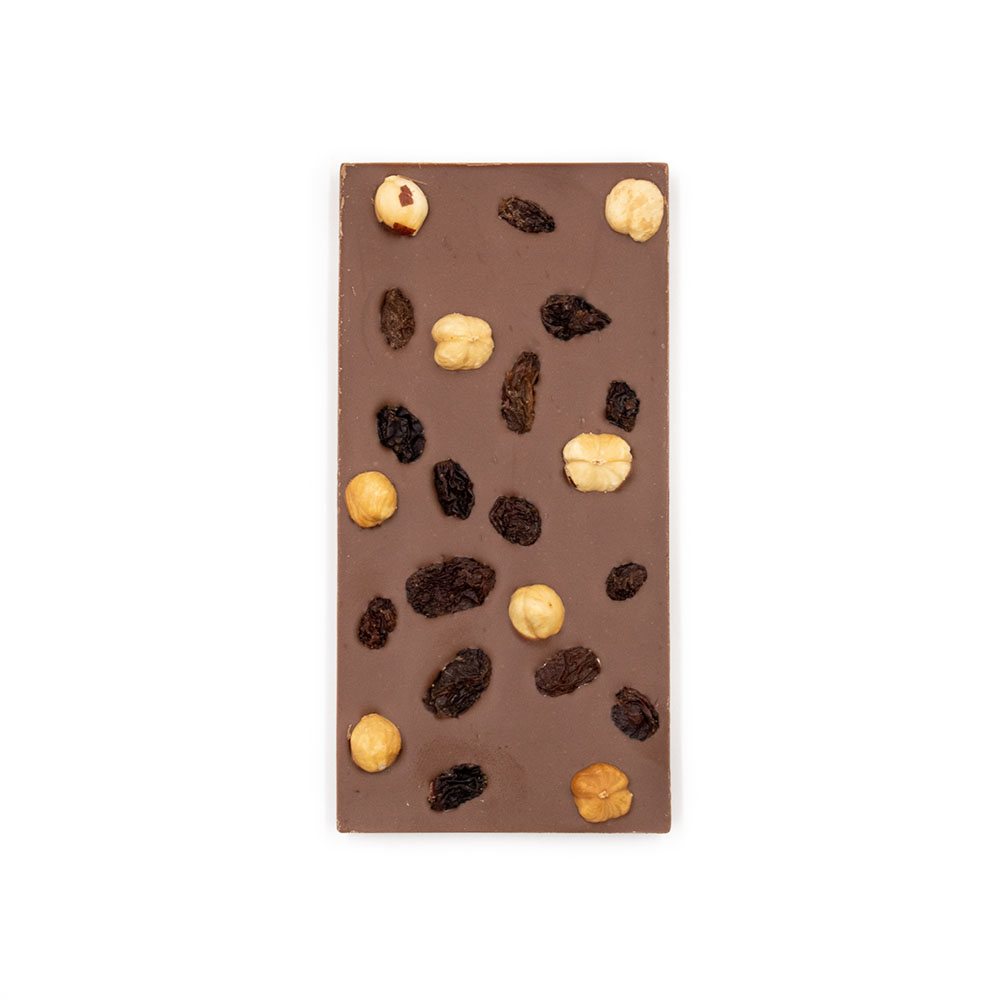 Ingredientes: Chocolate de LEITE (80%) cacau mínimo 34% [Açúcar, manteiga de cacau, LEITE gordo em pó, pasta de cacau, SORO DE LEITE EM PÓ, emulsionante (lecitina de girassol) e aroma natural], Passas (15%) e AVELÃS (5%).