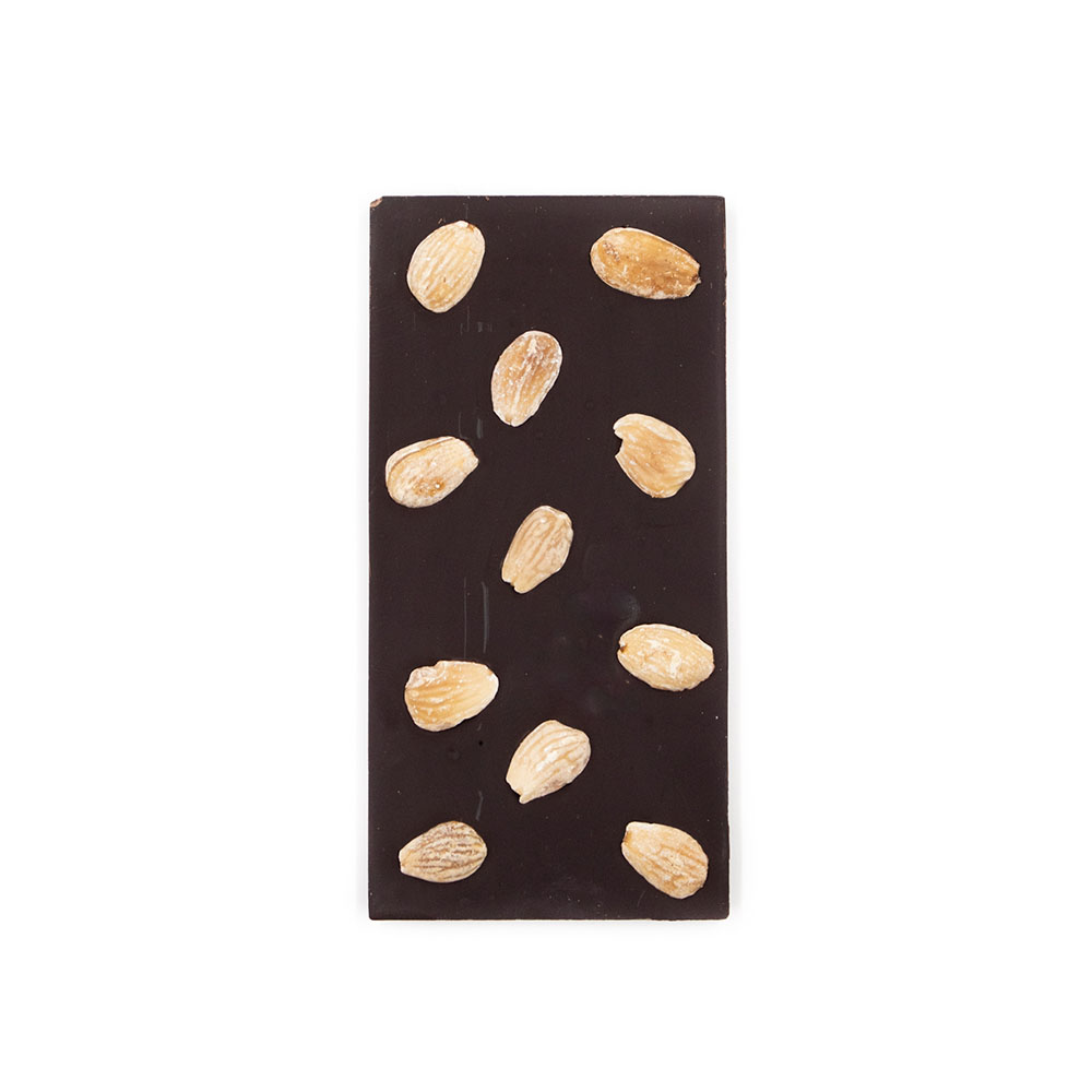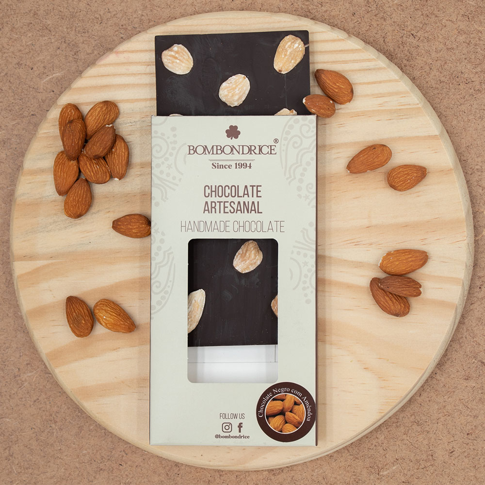 Ingredientes: Chocolate Negro (80%) cacau mínimo 70% [Pasta de Cacau, Açúcar, cacau magro em pó, manteiga de cacau, emulsionante (lecitina de girassol) e aroma natural] e AMÊNDOAS (20%).